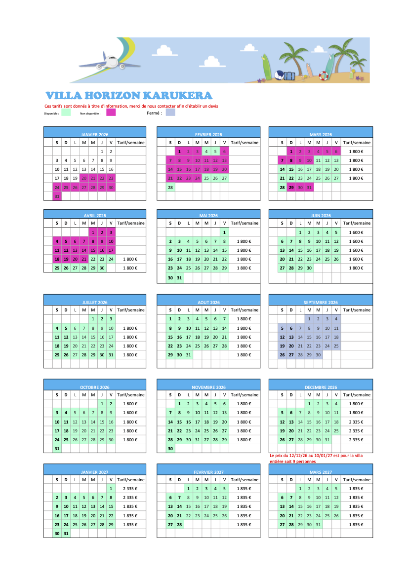 Tarifs et calendrier
